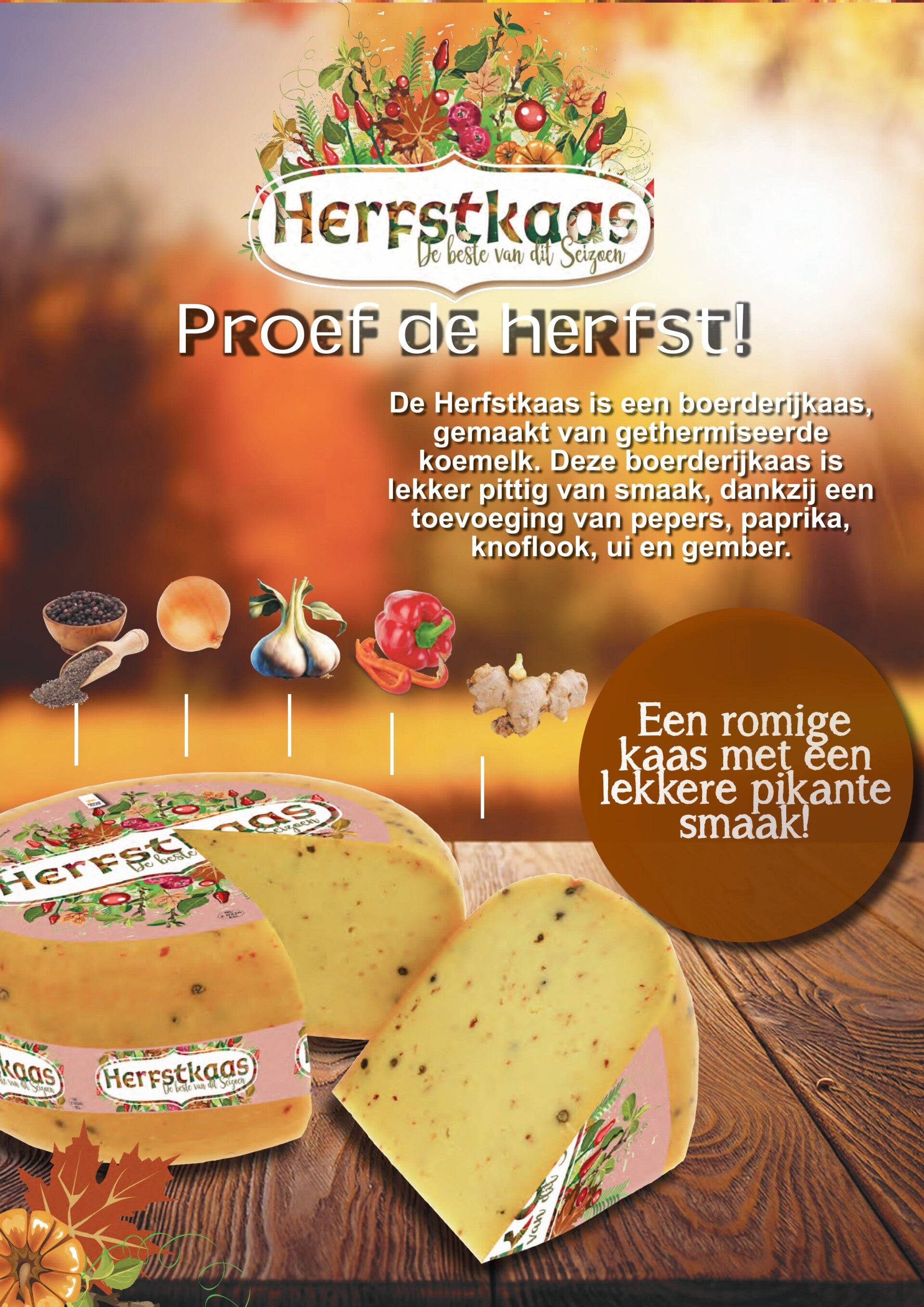 De Herfstkaas is een boerderijkaas, gemaakt van gethermiseerde koemelk. Deze boerderijkaas is lekker pittig van smaak, dankzij een toevoeging van pepers, paprika, knoflook, ui en gember. De Herfstkaas heeft circa 12 weken liggen rijpen in het pakhuis, wat ervoor zorgt dat het zuivel nog zacht en smeuïg is. Een romige kaas met een lekkere pikante smaak! Onmisbaar op je kaasplateau in het najaar.