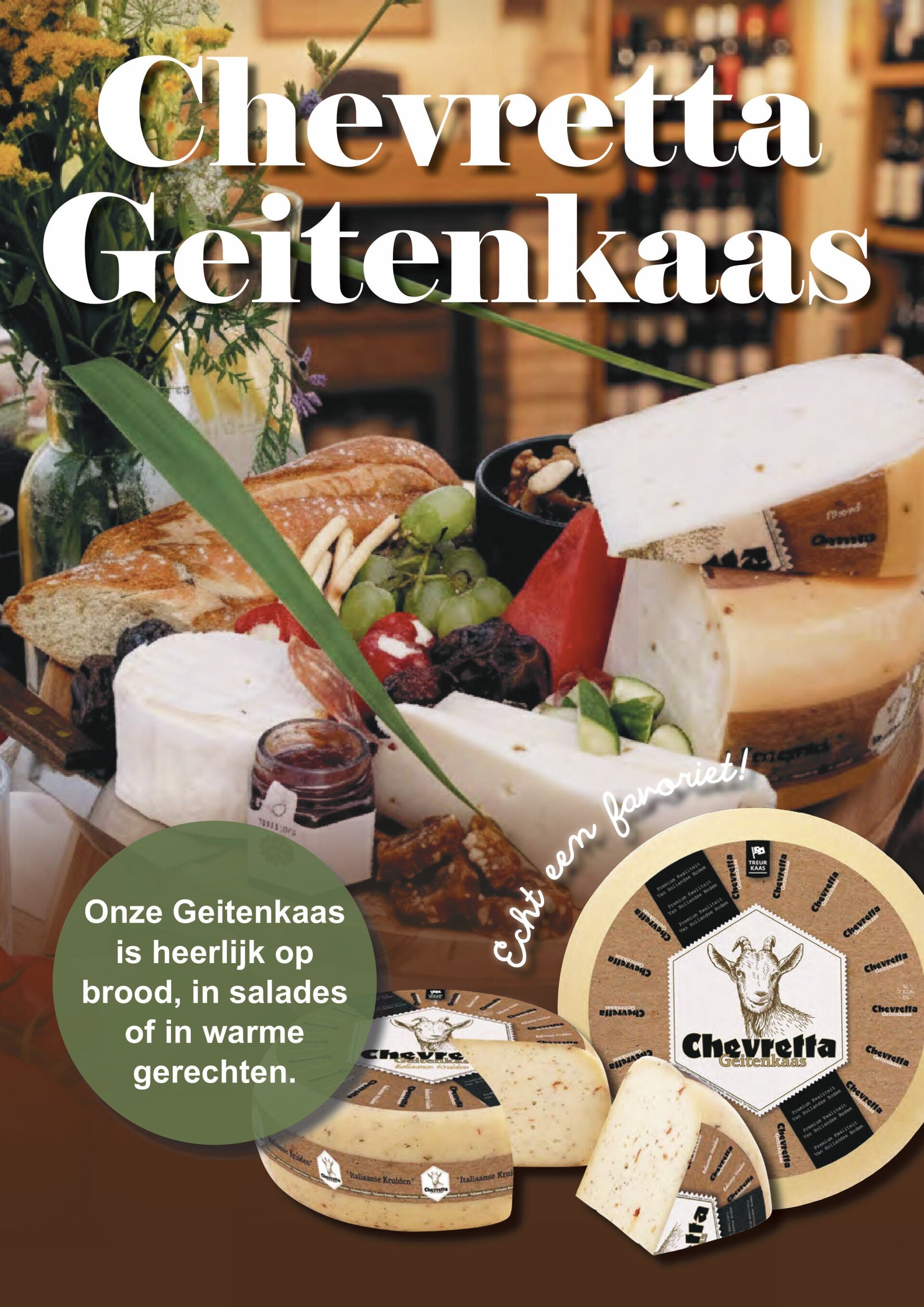 Chevretta is de lekkerste gangbare Hollandse geitenkaas. Dankzij een uitgebalanceerd voedingspatroon van speciale grassoorten, lijnzaad en stro is de melk altijd van constante hoge kwaliteit. Daardoor is Chevretta geitenkaas heel rijk van smaak en super smeuïg.