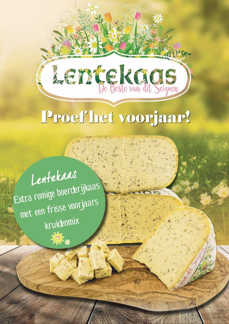 Voor het voorjaar hebben wij een heerlijke bijpassende kaas, namelijk de lentekaas! Onze lentekaas is gemaakt van gethermiseerde koemelk en bevat frisse toevoegingen: peterselie, ui, knoflook, honingklaver, bieslook, lente-ui en roze peperbes!